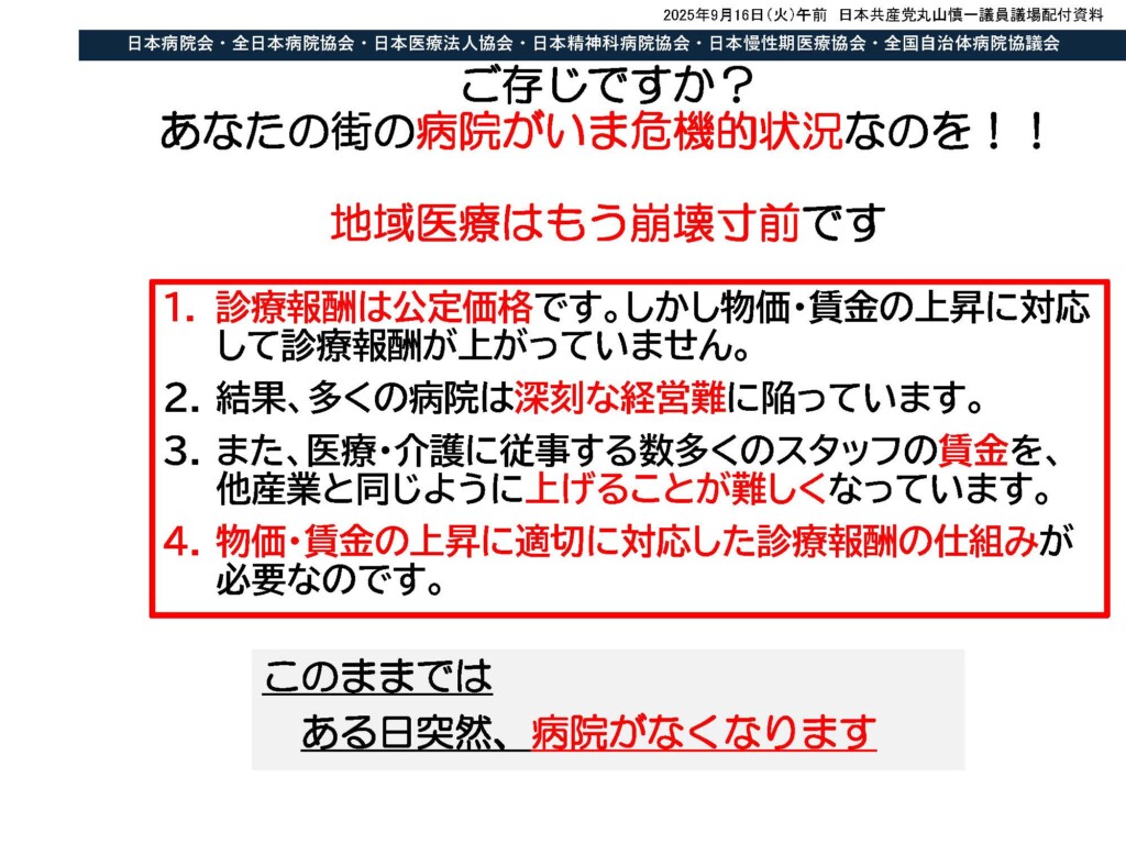 医療危機が迫っているにもかかわらず、自民、公明、維新の会は「3党合意」で、医療費の4兆円削減で合意し、その第一歩として「11万床の病床削減」を打ち出しました。「余剰ベッドを減らす」といいますが、パンデミックなどの有事に対応するには日ごろから余力のある医療体制が必要というのがコロナ禍の最大の教訓です。国に対して医療の削減は行わないよう求めるべきだと考えますが、いかがでしょうか。