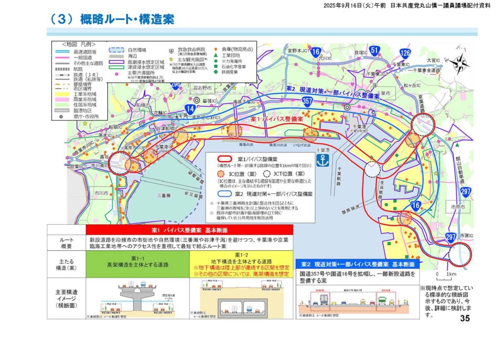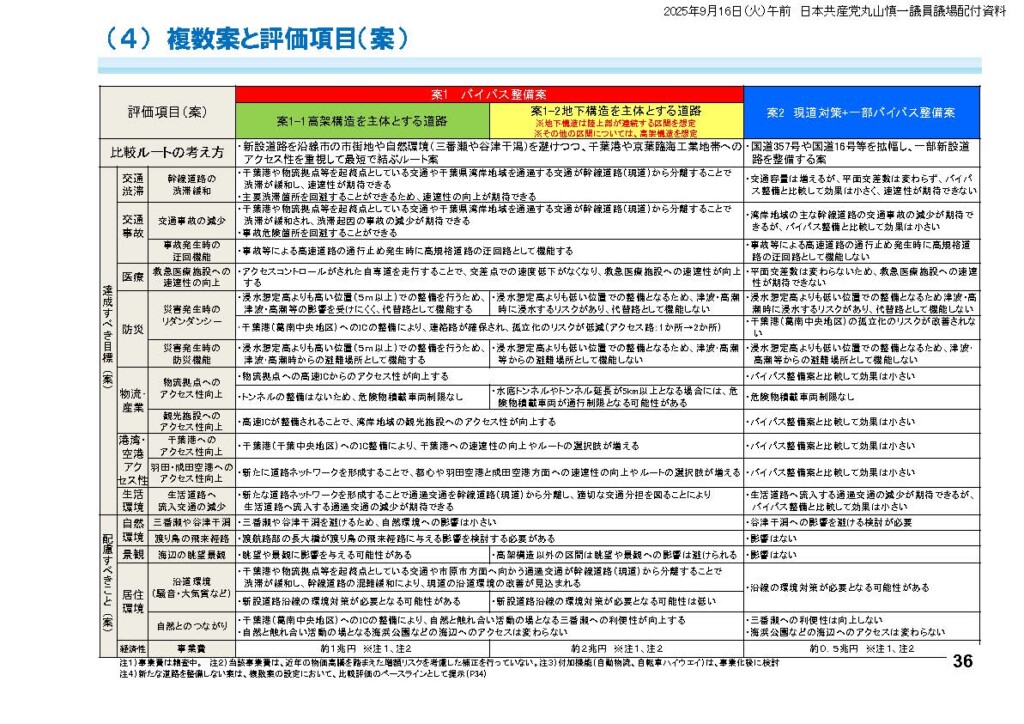 5月の有識者委員会には、東京湾岸沿いルートの高架構造と地下構造、それに加えて国道357号線などの現在ある道路の拡幅の3案が示されています。それぞれについて有識者委員会で設定した課題にそった評価が行われていますが、そのなかで、既存道路の拡幅では、「速達性が期待できない」「迂回路として機能しない」などが並んでおり、「達成すべき目標」13項目のうち、実に12項目が否定的な評価となっています。しかもこの案は、いまの国道357号線の両側にそれぞれ2車線から3車線を拡幅するというものですが、両側とも人家や企業の建物がびっしりと建っており、そのゆとりはまったくありません。効果が期待できず、実現性が乏しい案が、なぜ提示されたのでしょうか。お答えください。