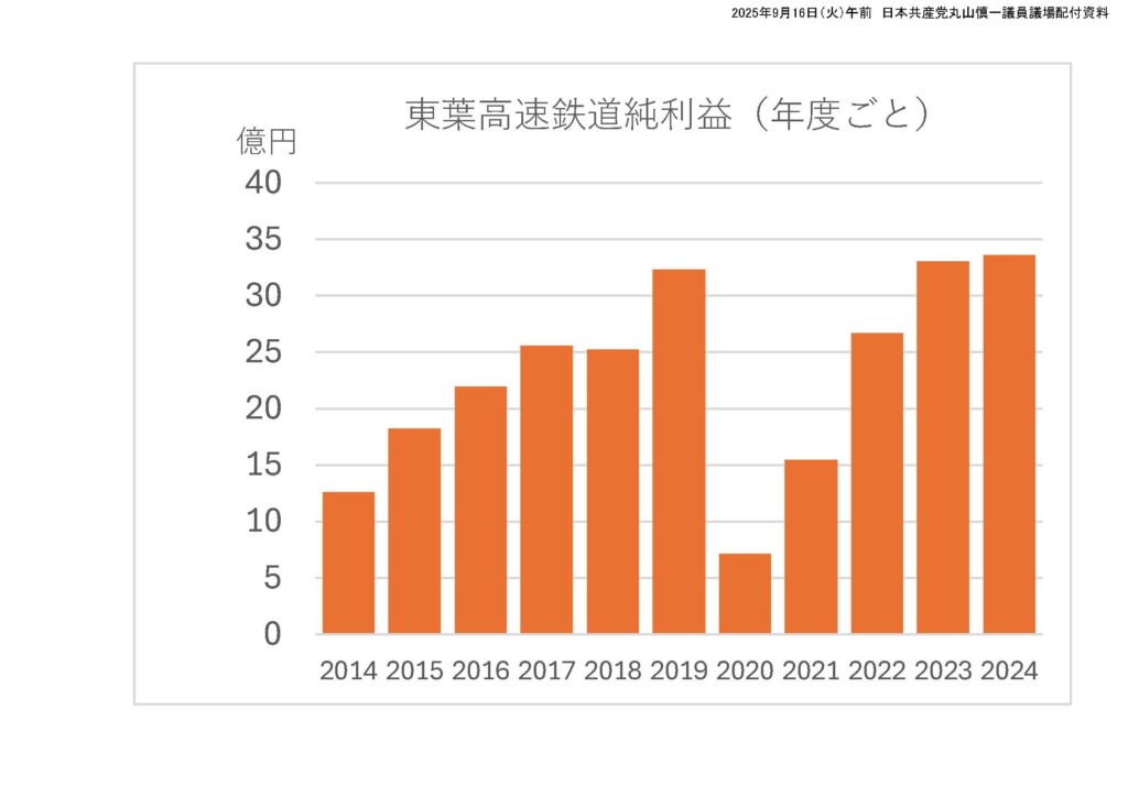 東葉高速鉄道の純利益はこの間増え続け、2023年度に33億5百万円で過去最高を記録し、昨年度は33億6千万円で過去最高を更新し、運賃値下げの可能性が出てきています。北総鉄道では、累積赤字の解消を機に学生割引を64・7%引き下げましたが、これによって定期券での輸送人員が83万人、6・5%も増えました。一方、東葉高速鉄道の通学定期収入は昨年度、約12億1千万円ですから、純利益から8億円程度投入すれば北総鉄道並みに引き下げることができます。地域住民に根差した鉄道として、増加傾向にある純利益を利用者に還元し、通学定期を大幅に引き下げるべきだと考えますが、いかがでしょうか。