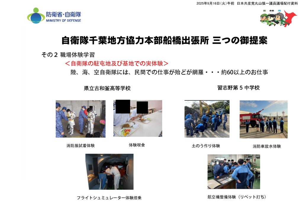 この間、自衛隊員の児童生徒への募集活動が強まっています。学校に現役自衛官が行って自衛隊の活動内容を説明したり、自衛官を講師にした防災講話なども行われています。職場体験学習では高校生が駐屯地の食堂で自衛隊員の食事を体験したり、ライフバックを背負い、フライトシミュレーターの操作や体験搭乗などをやっています。中学生は土嚢づくりや航空機整備体験など、実戦をイメージさせるようなことまで行われています。子ども向けの「防衛白書」までつくられて各学校への配布要請が自治体に行われています。自衛隊による児童生徒へのこうした勧誘活動について、千葉県教育委員会としてどこまで把握しているのか、お答えください。
