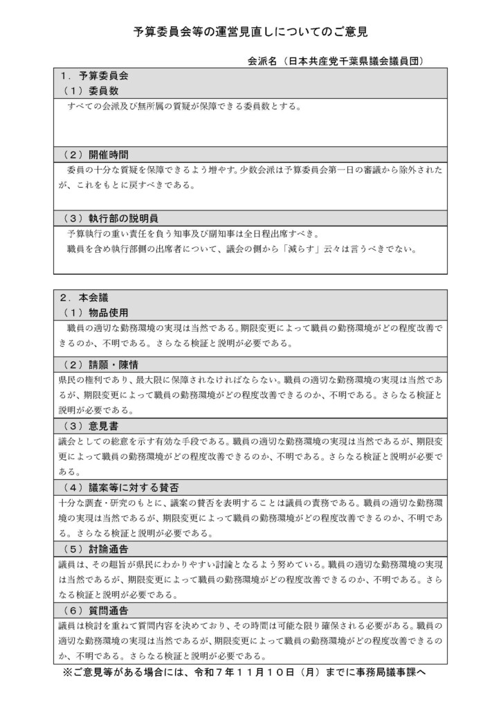 予算委員会等の運営見直しについて、日本共産党千葉県議団の見解を表明しました 投稿:2025年11月14日 2025年9月県議会の議会運営委員会で提案された「予算委員会等の運営見直しについて(案)」に対して、日本共産党の「意見」を提出しました。 予算委員会定数を見直し、一人会派や無所属の委員数が減る提案に対し、日本共産党は「すべての会派・無所属議員の質疑を保障する」視点などから「意見」をまとめ、提出をしました。 提案された「見直し案」 日本共産党千葉県議団が提出した意見 共有: Facebook で共有するにはクリックしてください (新しいウィンドウで開きます) Facebook クリックして X で共有 (新しいウィンドウで開きます) X 2026年度千葉県予算要望を行いました その他 関連記事2026年…県議会報告…家庭の県営…【2025…