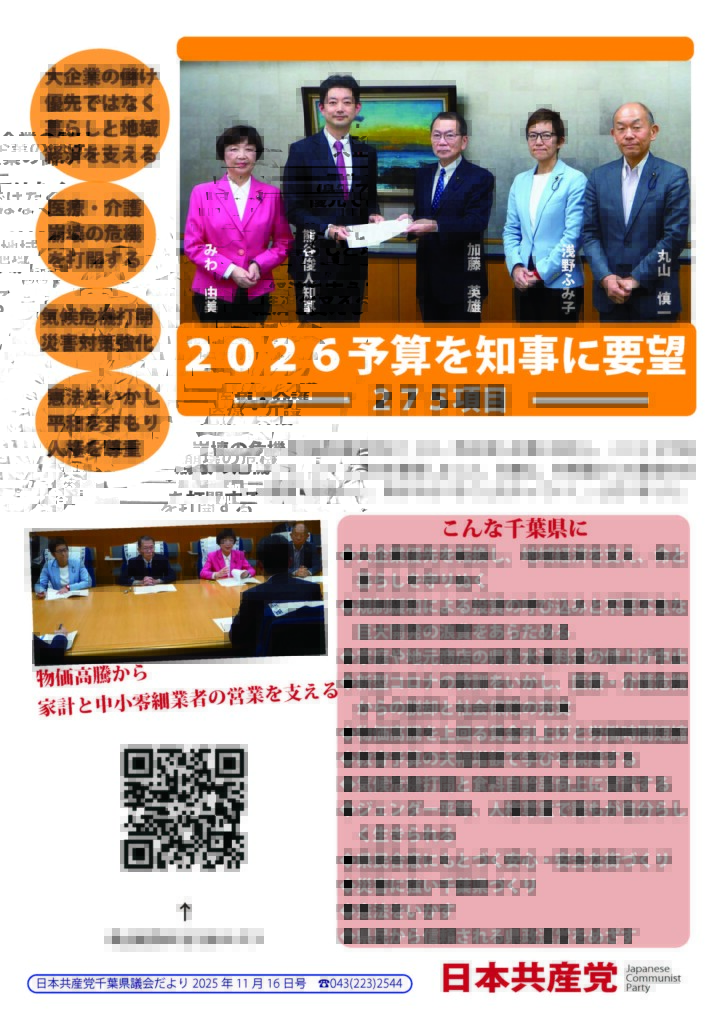 2025年11月の県議会だより 投稿:2025年11月19日 【11月16日号】2026年度の予算編成と県政運営の重点について知事に要望しました 11月16日号(PDF) 共有: Facebook で共有するにはクリックしてください (新しいウィンドウで開きます) Facebook クリックして X で共有 (新しいウィンドウで開きます) X 予算委員会等の運営見直しについて、日本共産党千葉県議団の見解を表明しました ジェンダー平等 その他 医療 子育て 教育 新型コロナ 災害 物価高騰対策 関連記事予算委員会…2026年…県議会報告…家庭の県営…
