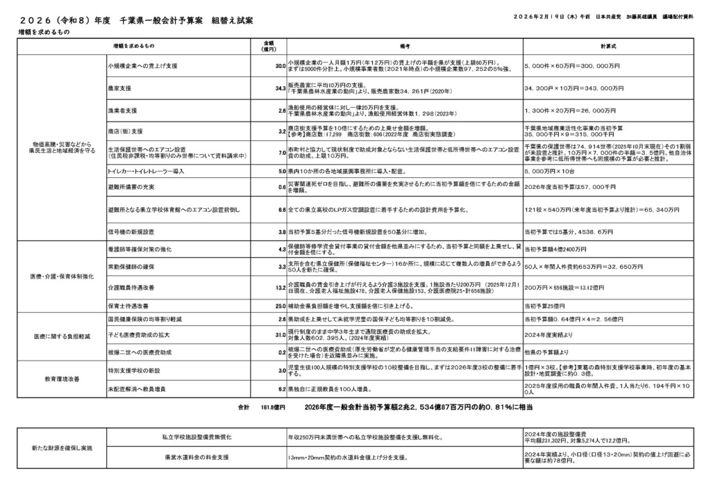 まずは来年度予算案について伺います。長引く物価高騰が県民生活や中小・小規模事業者の生業を直撃しているいま、県の予算は何よりも県民の暮らしや中小業者の営業を支えることを最優先すべきと考えます。その視点から来年度予算の組み替え案を提案いたします。お配りしております一覧表のとおり、組み替え総額は約182億円、当初予算の0.8%ほどの規模です。