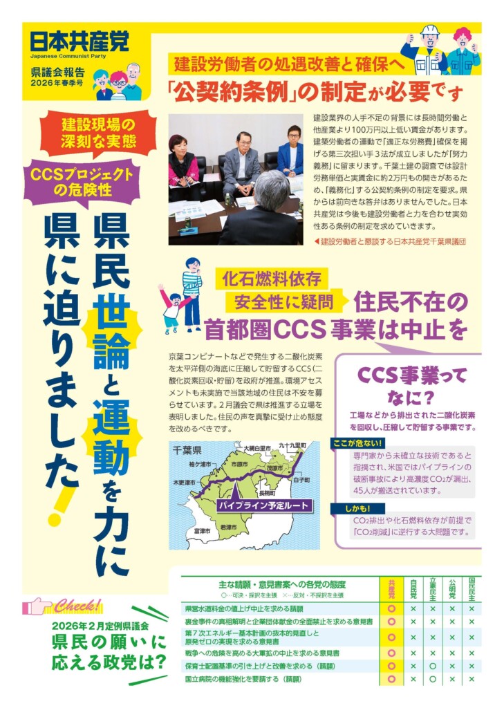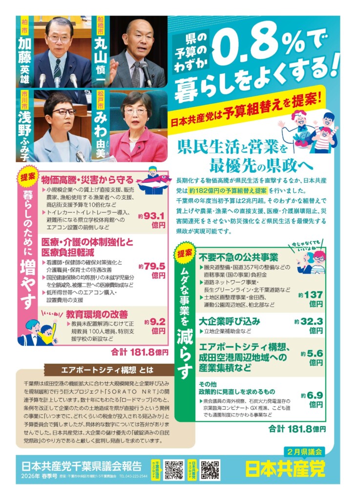 お知らせ 県議会報告 2026年春季号 投稿:2026年4月22日 県議会報告2026年春季号(PDF)をみる 共有: Facebook で共有 (新しいウィンドウで開きます) Facebook X で共有 (新しいウィンドウで開きます) X 【2026年2月県議会】日本共産党 浅野ふみ子県議 主な議案・請願への討論 その他 医療 子育て 教育 新型コロナ 災害 物価高騰対策 関連記事【2026…【2026…県議会報告…受験生をね…